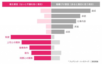 例えば、メンバーの満足度への影響では「ないと不満を抱く項目(衛生要因)」「あると満足に思う項目(動機づけ要因)」という分類ができます。