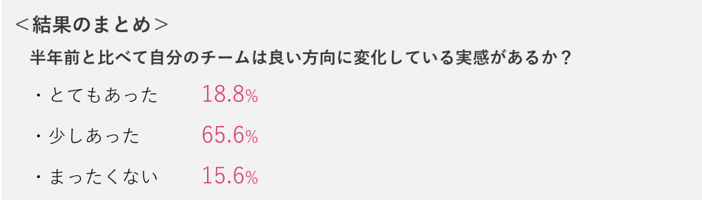 マネトレを利用する従業員数200名以上の企業に所属するマネジメントを行う役職についている方(リーダー、マネジャー、課長等)を対象に、「半年前と比べて自分のチームはよい方向に変化している実感があるか?」とアンケートを実施しました。